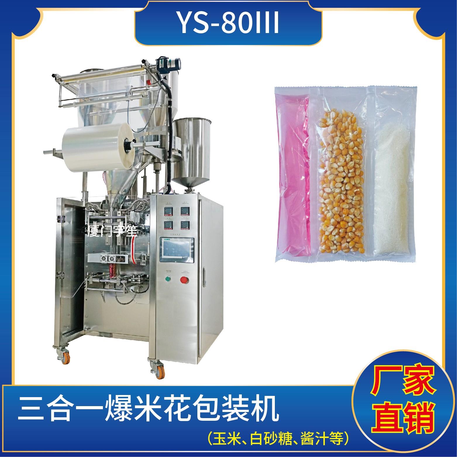 YS-80三列 三合一爆米花包裝機(使用鍍鋁、塑膠膜包裝)特點:1、適用于食品、醫(yī)藥、化工、化妝品行業(yè)中顆粒、粉劑、液體、醬料等物品的計量包裝。2、可自動完成制袋、計量、下料、封合、分切、計數,可根據客戶要求配置打印批號等功能。3、觸摸屏操作,PLC控制,伺服電機控制袋長,性能穩(wěn)定、調整方便、檢測準確。智能式溫…